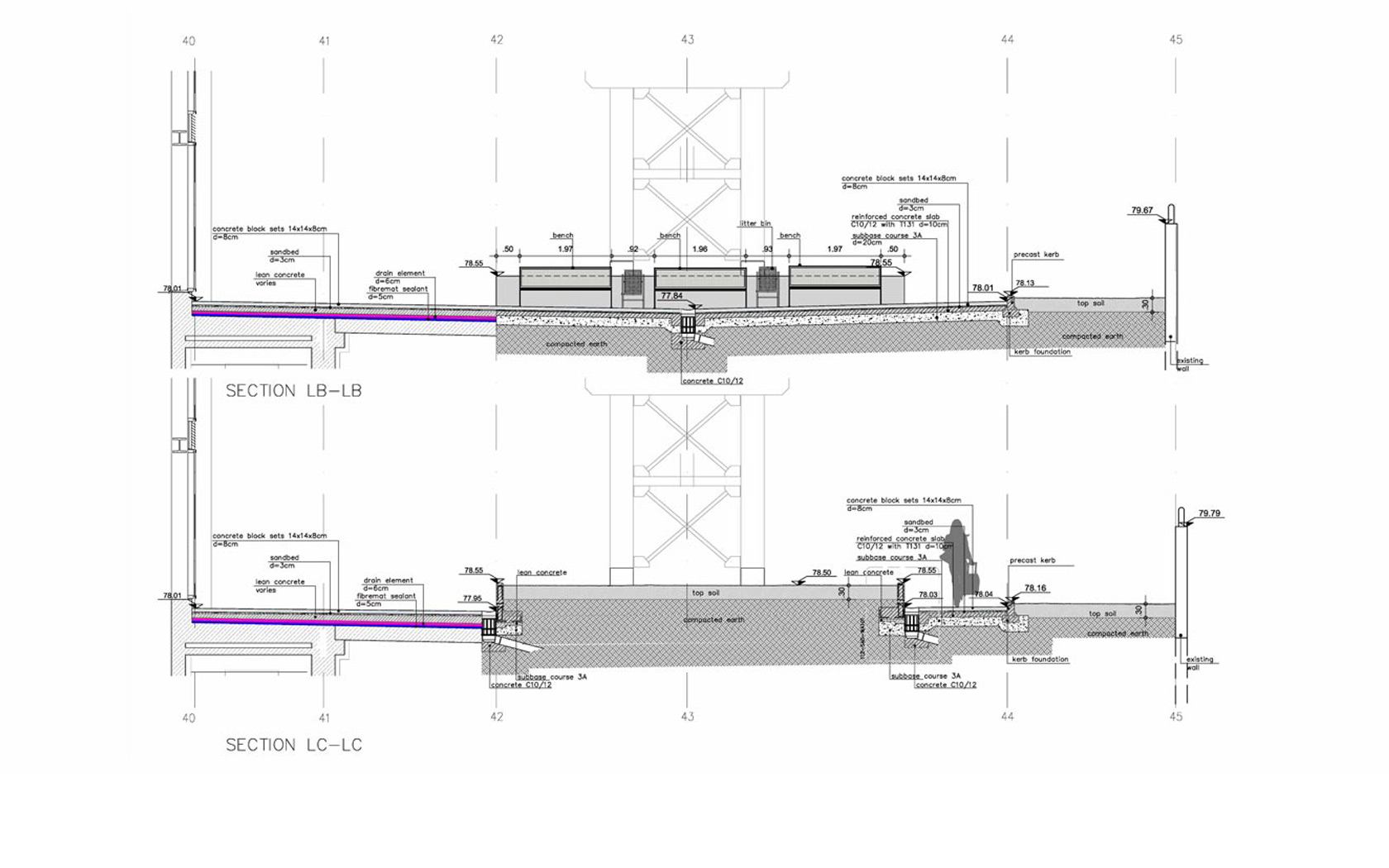Στη νότια πλευρά του Κτιρίου, οι κυκλικές ράμπες ανόδου και καθόδου πλαισιώνονται στο επίπεδο του εδάφους από τοξωτές αναπτύξεις θάμνων που δίνουν την αίσθηση ότι όλο το Κτίριο προβάλλεται μέσα από τον ήδη υφιστάμενο χώρο φύτευσης.