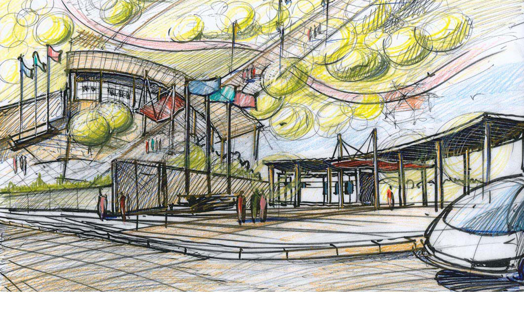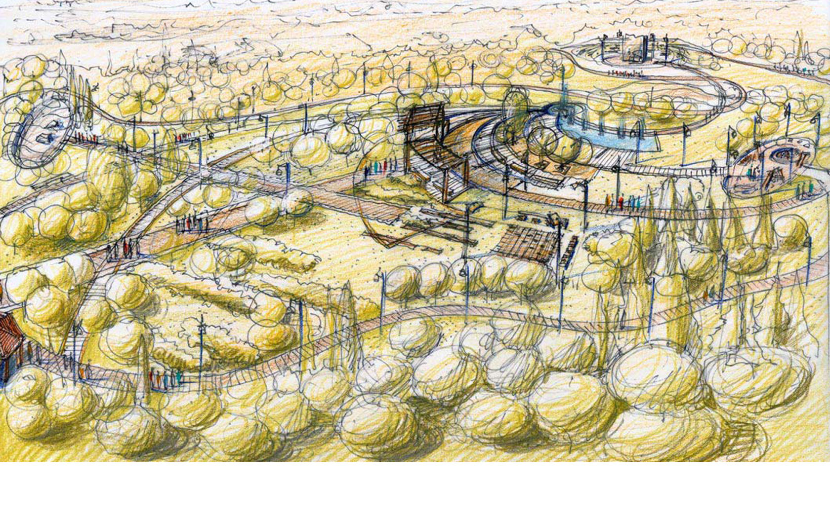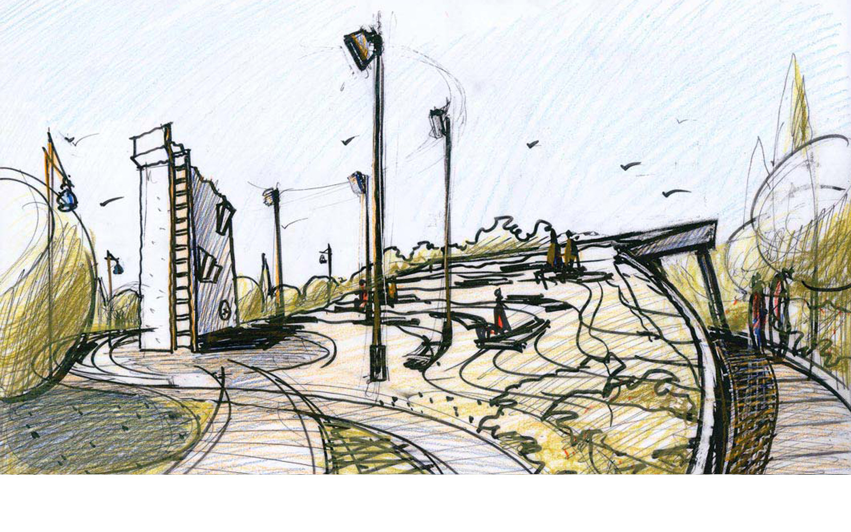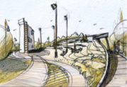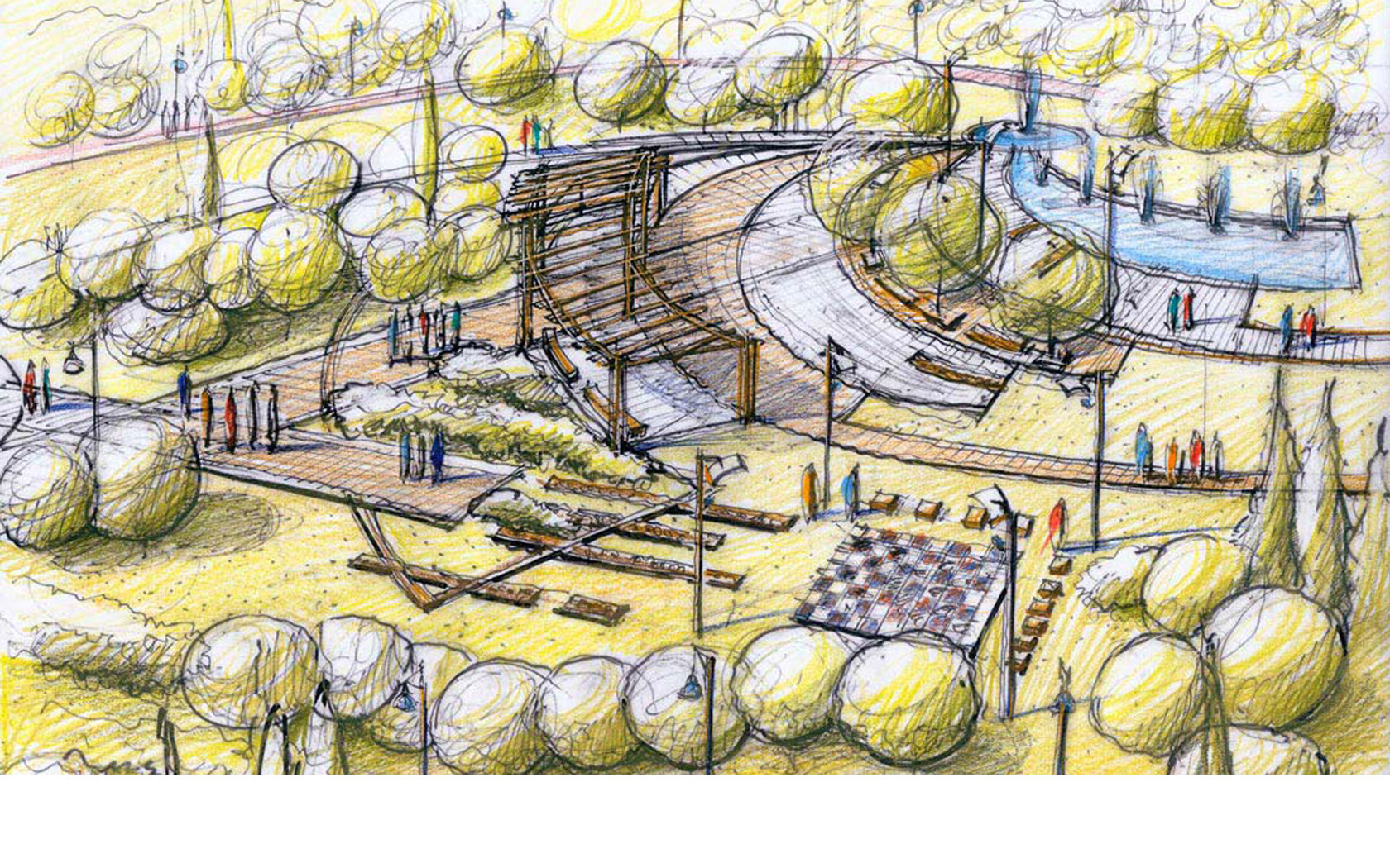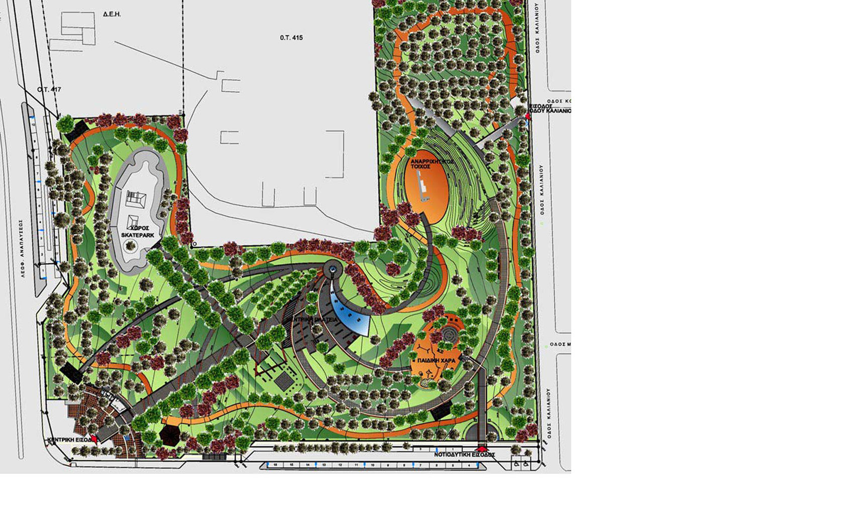 Από τον «πυρήνα» αυτό ξεκινούν καμπύλες επιφάνειες με εναλλαγές σκληρών δαπέδων, επιφάνειες με χλοοτάπητα και τέλος το υδάτινο στοιχείο αντίστοιχης μορφής.
